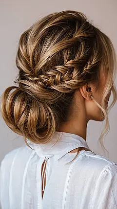 Getting bored with your medium hair just hanging around? We feel you! Medium hair is pretty awesome because it’s not super long and tangled, and not too short for fun stuff. It’s the perfect middle ground for trying out all sorts of cute looks. The style in the picture shows off exactly what we mean – it’s an updo with some cool braids and loose bits, looking fancy but also like you could actually *do* it. It’s proof that your medium length is totally ready for some seriously cute upgrades without needing a magic wand or a team of tiny hair elves.