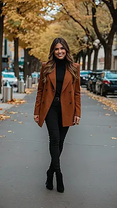 This outfit is like a warm hug for your style! The brown blazer says “I’m ready for pumpkin spice lattes and cozy nights,” while the black turtleneck and jeans give off a chill and confident vibe. It’s the perfect combo for those chilly fall days when you wanna look good but also feel comfy. Plus, those boots are super stylish, and let’s be real, everyone loves a good boot in the fall!