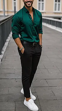 This dude is rockin’ a super sharp look that’s perfect for just about any occasion. The green shirt is definitely the star of the show! It pops against the classic black pants and white sneakers. This is a combo that says, “I’m confident and put-together, but not trying too hard.” And, let’s be real, who wouldn’t want to look this good? It’s basically the male version of a totally flawless outfit.
