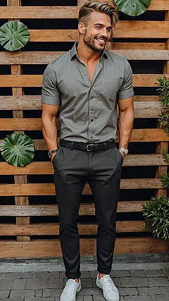 Check out this guy! He’s looking sharp in his grey shirt and pants, totally proving that fashion isn’t just a teenage thing. He’s got that effortless cool vibe going on, showing that you can definitely rock a stylish look, even if your TikTok scrolling days are mostly watching from the sidelines. He’s mixing smart trousers with cool white sneakers like a boss, which is way cooler than old school ideas about ‘sensible’ clothes.