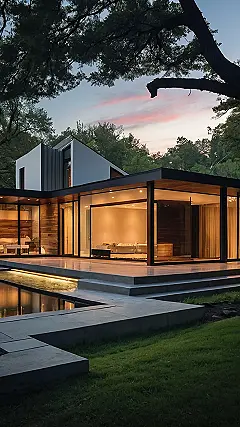 Check out this pad! It’s like a super cool geometry problem come to life. White walls doing the splits with a wooden hug? Giant windows looking straight out of a movie set? And is that a pool just begging for a cannonball contest? Forget boring boxes, this house screams “party at my place after the calculus exam!”