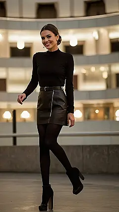 This outfit is seriously rocking the fall vibes! Think cozy sweater weather, but with a touch of edgy cool. That leather skirt says “I’m ready for a good time,” while the black turtleneck screams “I’m chic and comfortable”. And let’s not forget those killer boots, perfect for strutting your stuff on the dance floor! This look is perfect for a fun night out with friends, whether it’s a movie, dinner, or hitting the town for some dancing.