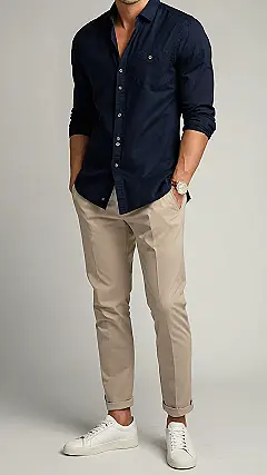 Want to look effortlessly cool without looking like you tried too hard? Check out this outfit! It’s like the uniform for a guy who’s about to casually save the world. A dark button-down shirt paired with khakis is a timeless combo, kind of like peanut butter and jelly, but for your clothes.