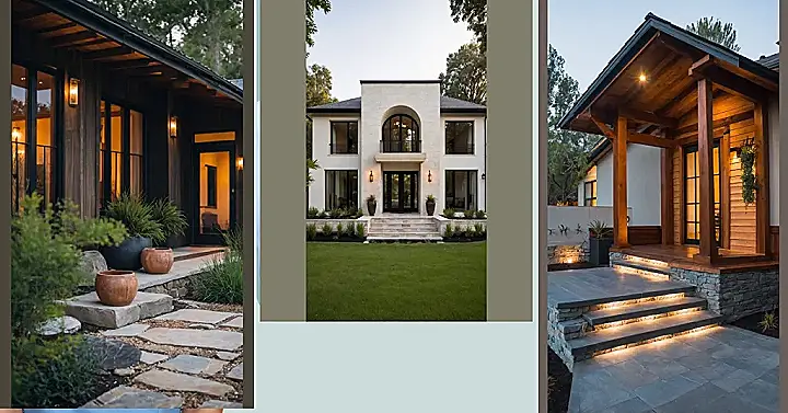 Looking at this ranch house entrance is like getting an instant upgrade notification for your curb appeal dreams. Those cool stone steps aren’t just practical; they’ve got these awesome hidden lights making them glow like a secret path to awesomeness. It’s the kind of spot where you half expect a friendly cowboy robot to greet you or maybe just find a comfy spot on that wooden porch to watch the sunset, hoping no tumbleweeds roll by and photobomb the view. This isn’t just a front door; it’s the grand entrance to good times.