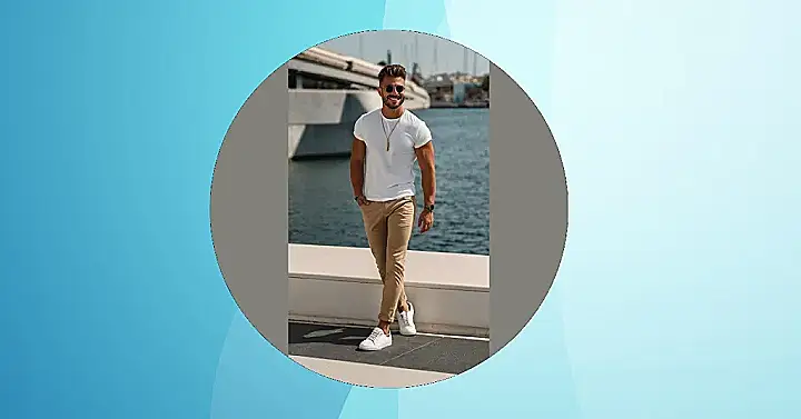 Whether you’re heading to the beach, chilling with friends, or just trying to impress that special someone, this is a great look to steal. The best part is, it’s super easy to pull off. Grab your favorite white t-shirt, find some pants that fit well (khakis are a solid choice!), and rock some stylish shoes. You’ll be turning heads in no time, looking like you’re ready to hop on that yacht in the background!