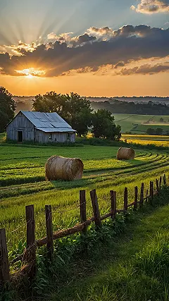 Taking rural photos can feel like stepping into a different world, especially when the sky puts on a show like this with sunbeams bursting out behind the clouds. You get out there with your camera, ready to capture the chill vibes, maybe hoping a cow photobombs your shot or that the wind doesn’t suddenly decide to redecorate your hair. It’s all about finding beauty in fields, old buildings, and those big round hay bales that honestly look like they could start rolling any second.