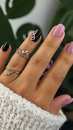 These aren’t your average “mom nails”—they’re the kind of nails that can handle homework help, a quick grocery run, and still look amazing for a dinner date! Check out that sleek black nail with the gold design, and then BAM, a soft pink right next to it. It’s like they’re saying, “Yeah, I’m responsible, but I also know how to have fun.”