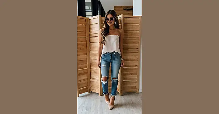 This outfit screams “fall vibes” without being too heavy! It’s like a warm hug on a crisp autumn day. The ripped jeans add a touch of cool, the white tank top keeps things breezy, and the heels say “I’m ready for anything.” This look is perfect for hanging out with friends, grabbing coffee, or even heading to class – it’s totally versatile! And let’s be honest, who doesn’t love a good pair of ripped jeans? They’re like the ultimate “I’m not afraid to be myself” statement.
