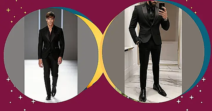 This guy is rocking a suit so sharp it could cut butter! It’s all black, from his shoes to his slicked-back hair, making him look like a secret agent ready to save the world. He’s got the confidence of a superhero and the style of a movie star. You just know this dude is about to make a grand entrance, leaving everyone in awe of his amazing style!