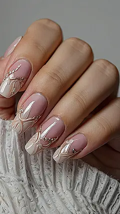 These nails are screaming spring vibes, right? The light pink color is super subtle, like a barely-there blush, and then BAM! You get hit with these fancy gold details that look like little flowers or maybe even wings. It’s like your nails are ready to ditch the winter blues and fly into warmer weather. Forget boring nails, these are like tiny masterpieces that would totally make your Instagram pop.