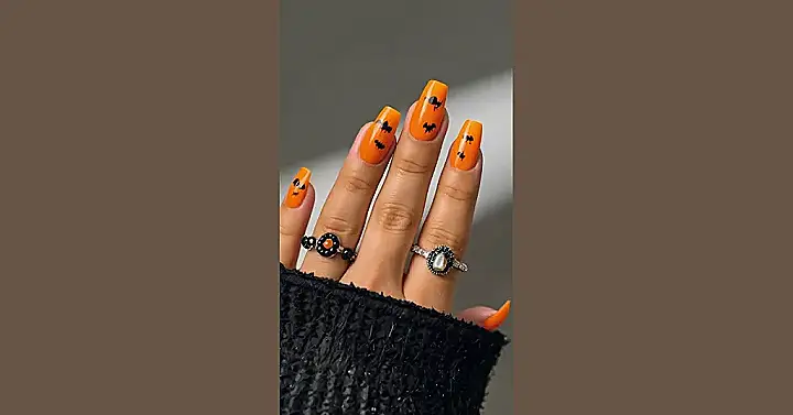 And let’s not forget those awesome rings! With black stones and spooky vibes, they’re the perfect touch to complete the Halloween look. No need for candy corn or scary masks – this is a look that’s all about the details! Who needs a costume when you’ve got nail art this good?