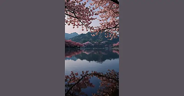This picture is like a real-life screensaver! Imagine having this gorgeous view as your wallpaper – pink cherry blossoms blooming by a calm lake, with mountains in the background all bathed in the soft light of sunset. It’s so peaceful and pretty, it almost looks too good to be true, like something out of a fairytale or a really awesome anime. You’d definitely be the envy of everyone who saw your phone or computer!