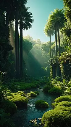 This picture is like stepping into a secret world. It looks super mysterious with all those tall, dark trees in the background. The light is kind of spooky, making the trees look like they’re wearing a ghostly blue mist. It’s like a scene from a movie where the hero is about to find some super-cool, hidden treasure!