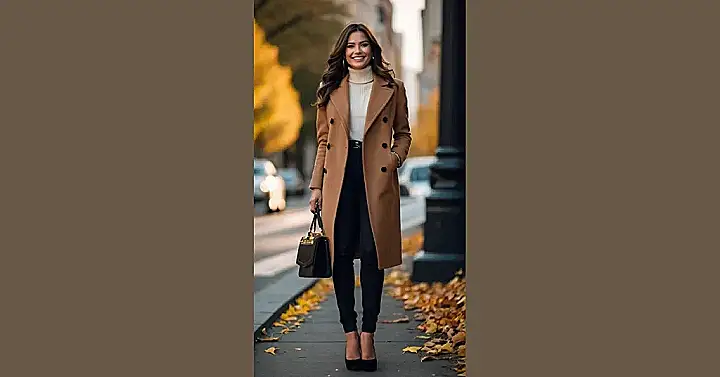This outfit is seriously on point for a fall night out! Imagine: you’re heading out with friends, the air is crisp and cool, and you’re rocking this cozy coat and sleek black pants. You’ll be the most stylish person in the room! That camel-colored coat is like a warm hug, and the black outfit just screams “sophisticated.” And those heels? They’ll make you feel like you’re ready to take on the world, and maybe even impress that cute guy at the coffee shop.