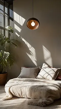 That light fixture looks like a tiny sun hanging in your room, perfect for pretending you’re an astronaut chilling on a really comfy asteroid. Add a soft blanket like the one pictured and some pillows, and bam! You’ve got yourself the ultimate “Do Not Disturb, Orbiting the Couch” zone. This home retreat setup is basically your personal mission control for maximum relaxation.