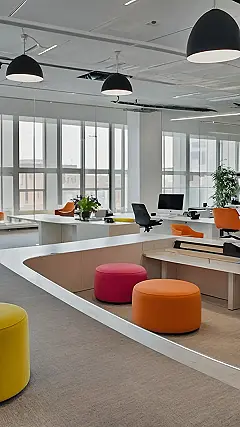 This office looks like a blast! With bright colours, comfy seating, and lots of natural light, who wouldn’t want to work here? Imagine sitting on a squishy, orange beanbag and chatting with your friends during a break. It’s like having a giant living room at work, but instead of watching TV, you’re working on cool projects!