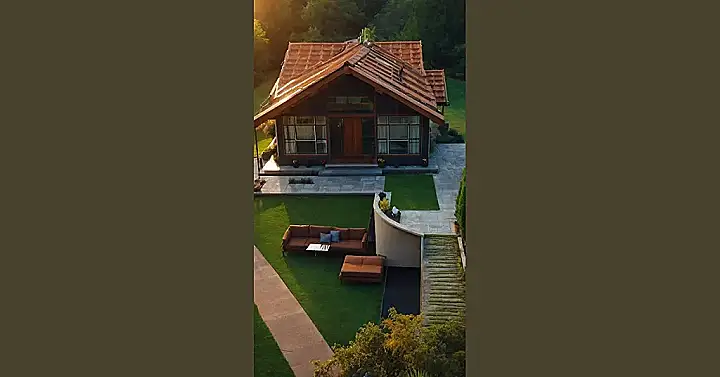 This house is so beautiful, it almost looks like it was designed for a movie set. The rusty red roof is like something out of a fairytale, and the lush green lawn is perfect for a picnic or a game of frisbee. You can almost picture yourself sipping lemonade on the comfy patio furniture and taking in the breathtaking view. Just try not to step on the tiny plants growing in the concrete!