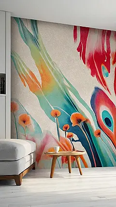 This wallpaper is like if your fruit salad decided to have a party on your wall, and everyone invited the coolest abstract art they knew. Seriously, it’s so colorful and swirly, it might hypnotize your guests! If you stare at it long enough, you might even start seeing secret messages, or maybe just feel really hungry for a smoothie.