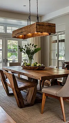 Check out this dining room decor, it’s like a fancy cabin exploded with good taste! The wood everywhere gives off some serious nature vibes, like you’re about to eat a gourmet meal in a really stylish treehouse. That light fixture looks like it was chopped straight out of a giant redwood, and the bench is so sturdy you could probably build a fort on it.