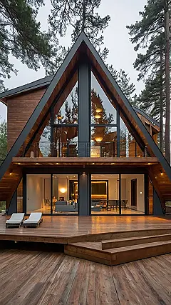 This isn’t just a house; it’s like living inside a giant Toblerone bar! Seriously, look at that A-frame design – it’s so cool it makes geometry look fun. Can you imagine waking up every morning and feeling like you’re in a luxury treehouse, except with way better furniture and zero chance of falling out? The huge windows mean you’d get tons of natural light, perfect for taking selfies or just chilling with your friends, pretending you’re all famous architects.