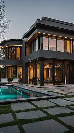 This picture is giving me serious “I wish I lived there” vibes! It’s a modern mansion house, but not the kind of fancy place you’d imagine your grandparents living in. It’s sleek and stylish, like something out of a magazine. There’s a cool, swimming pool, just begging for a cannonball (or maybe a gentle dip if you’re feeling fancy). The lights around the house are casting reflections on the water, making the whole scene look even more dreamy.