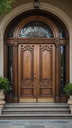 Stepping up to a main entry like this feels like you’re about to embark on an epic quest or maybe just hoping there’s pizza inside. This isn’t your average flimsy door; it’s a solid piece of wood with all sorts of cool carved panels and neat little windows that probably watch everything. It’s the official handshake of the house, giving you a hint of what might be waiting on the other side, whether it’s a super strict parent or someone who’s just happy you brought snacks. This door basically says, “Welcome, if you dare!”