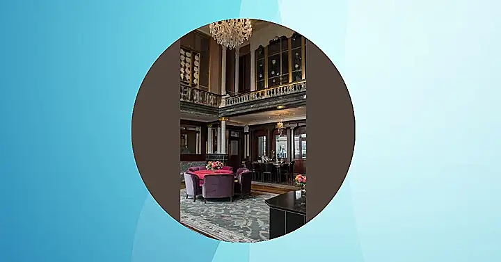 This photo makes me think of a fancy party in a mansion. It’s got all the glitz and glam you’d expect – a huge chandelier, shiny wood floors, and a big ol’ rug that looks like it’s worth more than my entire wardrobe! The plush velvet chairs and that gorgeous round table are begging for a big feast and some good conversation. Maybe they’re serving fancy cocktails, or maybe even tea and crumpets? Honestly, I’d be happy to sit down and enjoy the view, even if all I got was a glass of water!