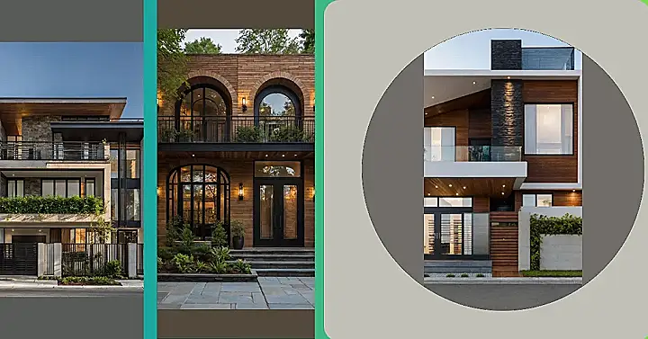 Check out how this place uses stone, dark panels, and even wood accents – it’s like a fashion show but made of building materials! And those huge windows and lit-up balconies? They’re basically saying, “Hey world, look how awesome I am, even at night!” Getting the front elevation design just right is super important because nobody wants their house to look like it rolled out of bed without brushing its teeth. It’s all about making a great first impression, architectural style!