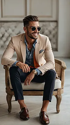 Check out this guy, rocking a blue suit jacket over a cool patterned shirt with bright white pants and those slick brown loafers. He’s sitting there with his coffee looking way too calm and collected, like he just closed a major deal or successfully navigated the snack aisle without buying everything. His ‘well dressed men outfit’ is so on point, you almost expect the coffee cups to bow down in respect. It’s the kind of look that says, “Yes, I ironed these pants, and yes, I look this good doing absolutely nothing.”