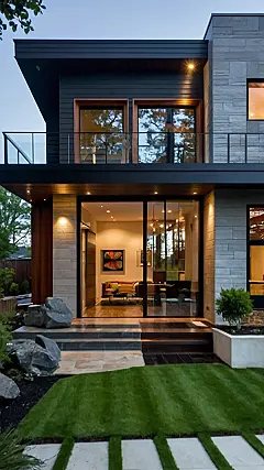 Just imagine rolling up to this pad in your self-driving electric scooter! The pathway to the front door looks like it’s straight out of a futuristic movie, making you feel like you’re about to embark on a secret mission. The dark exterior is balanced perfectly with warm wood tones, and the landscaping is so on-point it probably has its own personal stylist. Let’s be real, living here would be like starring in your own reality show – “Keeping Up With the Joneses…But Way More Stylish!”