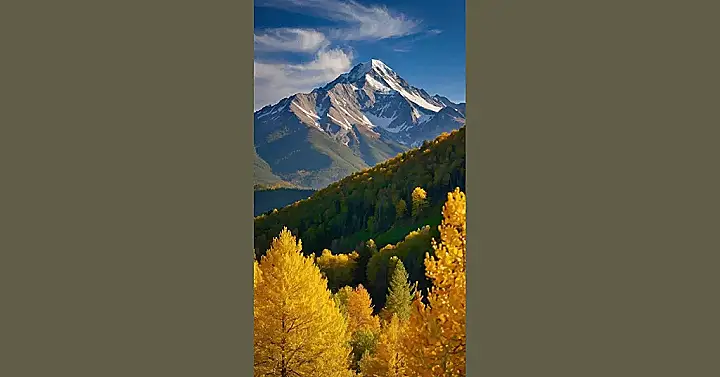 The picture shows a mountain so tall it almost touches the clouds. It’s like a giant white cake with frosting on top. The mountain is surrounded by trees that have changed into beautiful shades of yellow, orange, and red. It’s like someone spilled a giant bucket of paint all over the forest!
