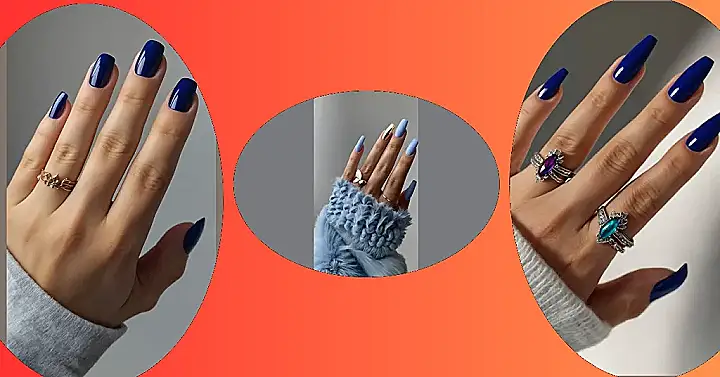 The image shows a hand with perfectly manicured nails painted a deep, rich blue. It’s like a little piece of the night sky on each finger! The blue color is so vibrant and shiny, it almost looks like you could see your reflection in it. This blue nail polish is seriously making a statement – it’s saying, “Hey, look at me, I’m cool and confident, and I’m not afraid to stand out!” It’s the kind of look that’s perfect for a night out with friends or even just a casual day at school.