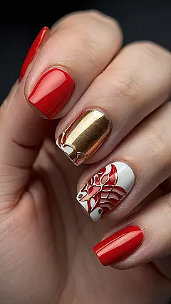 And these aren’t just plain old red nails, nope! You’ve got the cool gold one that looks like you dipped your finger in pirate treasure – talk about fancy! Then there’s the white one with the awesome red and gold design, which is practically a tiny piece of art on your finger. Rocking nails like these means you’re officially accepting your mission to be the most stylish person at the park or wherever spring takes you. Get ready for compliments; these nails are basically magnets for good vibes and people asking “OMG, where did you get your nails done?!”