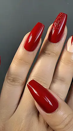 These nails are so long, they could practically climb a tree! Seriously though, this red polish is the perfect way to make a statement. It’s like a fiery sunset, but on your fingertips! The sparkly nail is a fun touch, too – maybe it represents a little firefly flitting around in the night. If you want nails that are as bold as the great outdoors, look no further!