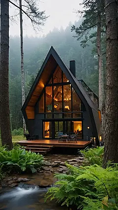 Isn’t it cool how this house is basically a giant triangle chilling out in the woods? Forget stress – imagine waking up to the sound of that little stream and breathing in super fresh air. You could totally ditch your phone, grab a book, and just become one with the ferns. Or, you know, just nap on that sweet deck. Either way, this place is screaming “relax!”