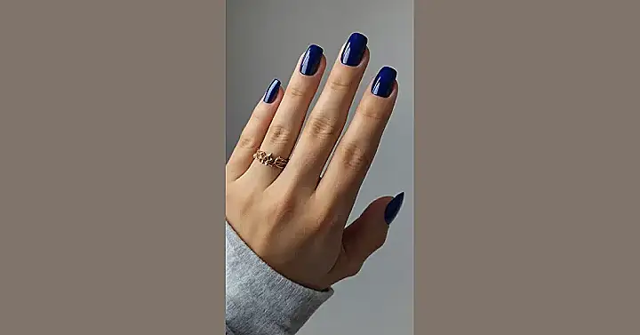 The image shows a hand with perfectly manicured nails painted a deep, rich blue. It’s like a little piece of the night sky on each finger! The blue color is so vibrant and shiny, it almost looks like you could see your reflection in it. This blue nail polish is seriously making a statement – it’s saying, “Hey, look at me, I’m cool and confident, and I’m not afraid to stand out!” It’s the kind of look that’s perfect for a night out with friends or even just a casual day at school.