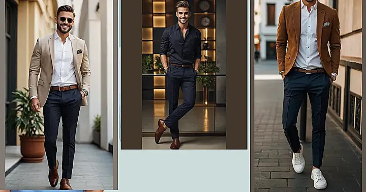 Remember how you thought business outfits meant stiff suits and shoes that pinch your toes? Well, check out this guy! He’s rocking a cool brown blazer and sharp navy pants, looking all official. But peek down at his feet – yep, those are clean white sneakers! It’s like he whispered to his shoes, “Today, we conquer the meeting room *and* feel comfy doing it.” Who knew men’s business outfits could look this good without making you walk like a robot?