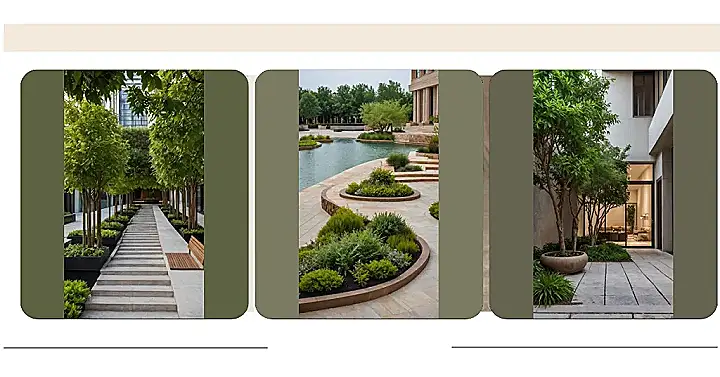 Creating places like this is all about making busy spots feel a bit more like a green escape. When you’re in a place with lots of buildings and roads, adding perfectly designed gardens gives people somewhere nice to chill, walk around, or just look at something pretty that isn’t concrete. It’s like bringing a little bit of organized natural beauty into the mix, proving you can have fancy design and fresh air all at the same time.
