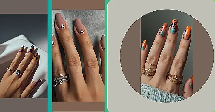 These nails are giving us major fall vibes without being too over-the-top. The cool, neutral colors like purple and blue mixed with pops of yellow and orange are like a walk through a colorful autumn forest. They’re subtle enough for everyday wear but still super trendy. You could totally pair these with a cozy sweater and pumpkin spice latte for the ultimate fall look!