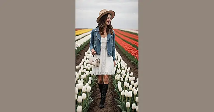 Stepping into a field of thousands of colorful tulips like this picture? You definitely need an outfit that says, “I came to see the flowers, but also, I *am* a flower.” This whole vibe with the flowy white dress, cool denim jacket, and that awesome hat just screams ‘effortlessly chic’ while navigating rows of blooms. You’ve gotta look picture-ready when the background is this epic, even if you secretly wonder if you’ll trip over a rogue tulip bulb or get dirt on those nice boots. It’s all about that perfect balance of “ready for my close-up” and “hoping I don’t mess up my hair in the breezy field.”