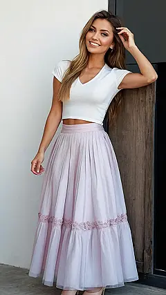 This isn’t your grandma’s pink skirt! This dreamy, light-as-air number is totally modern and perfect for a fun day out or a stylish afternoon with friends. Pair it with a simple white crop top like the model, and suddenly you’re ready to conquer the world (or at least, nail that perfect Instagram photo). It’s the kind of outfit that makes you feel like a princess, without all the stuffy royal rules.
