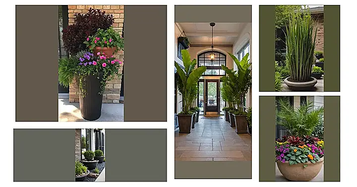 Just peek inside those pots in the image – it’s like a whole tiny ecosystem thriving together. You’ve got the tall, dark, and mysterious plants adding some drama, fluffy ferns doing their best leafy dance moves, and then bam! Bright pink and purple flowers showing off like floral superstars. Plus, those little vines tumbling over the side? They’re basically saying, “Hey, follow us inside!” It’s a perfect mix that proves front porch planters aren’t just containers, they’re tiny worlds of awesome waiting to greet you.
