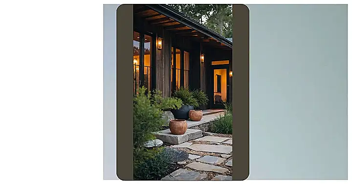 Looking at this ranch house entrance is like getting an instant upgrade notification for your curb appeal dreams. Those cool stone steps aren’t just practical; they’ve got these awesome hidden lights making them glow like a secret path to awesomeness. It’s the kind of spot where you half expect a friendly cowboy robot to greet you or maybe just find a comfy spot on that wooden porch to watch the sunset, hoping no tumbleweeds roll by and photobomb the view. This isn’t just a front door; it’s the grand entrance to good times.