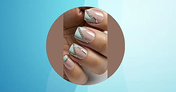 You know those times you want to look fancy but also like you didn’t spend hours getting ready? These nails totally get it! Peep that super smooth nude pink blending into a cool, calm blue – it’s like a chill sunset happening right on your fingertips. And check out that little slanted gold line with tiny sparkly bits! It’s just enough bling to feel special without looking like you dipped your hand in a glitter factory explosion. It’s basically the nail version of wearing a comfy hoodie with really cool sneakers – looks easy, feels awesome, and everyone thinks you’re effortlessly stylish.