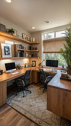 Check out this home office setup! It looks like something out of a movie where the character is super smart and gets everything done effortlessly. You’ve got the big, sleek wooden desk that makes you feel important, comfy chairs that probably make homework way less painful (or just perfect for scrolling), and shelves stacked with books making you look like a total genius. There’s even a cool plant to pretend you’re connecting with nature while you’re stuck inside. It’s definitely a step up from trying to work on your bed.