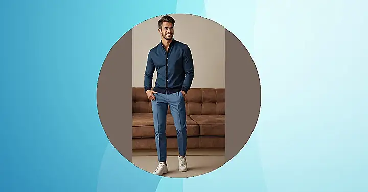 This guy’s outfit is seriously stylish, proving that “smart casual” doesn’t mean boring! He’s rocking a dark blue cardigan (that’s like a fancy sweater-jacket) over a shirt, paired with some cool light blue pants and crisp white sneakers. It’s the kind of look that works for a casual Friday at school, a hang-out with friends, or even a nice dinner – without looking like you’re trying *too* hard. It’s all about looking effortlessly awesome, which is way harder than it sounds!
