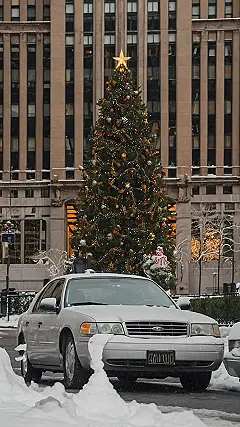 Imagine you’re in New York City during Christmas time. The snow is falling, and the city is lit up like a giant Christmas tree. You’re driving along, and suddenly, you spot a HUGE Christmas tree right in the middle of the street! It’s so big that it’s practically blocking the road. This picture shows just that. The snow is piled up around this car, but the Christmas tree is still the main event, looking absolutely stunning. It’s like the whole city is celebrating, even with the snow, because the festive spirit is just too strong to be stopped.