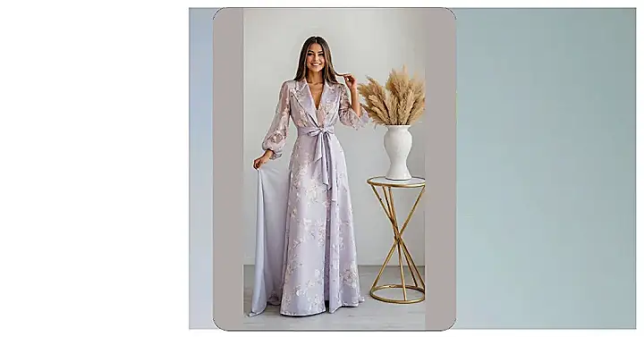 Wow, this dress is like wearing a dream made of lilac and flowers! It’s so flowy you could probably float down the stairs, and those sleeves make you feel instantly fancy, like you should be sipping something sparkly while dramatically looking out a window. Putting on something this elegant just makes you want to strike a pose and maybe even practice your runway walk in the hallway, even if it’s just leading to the kitchen for snacks. It’s definitely got that “ready for anything fabulous” vibe.
