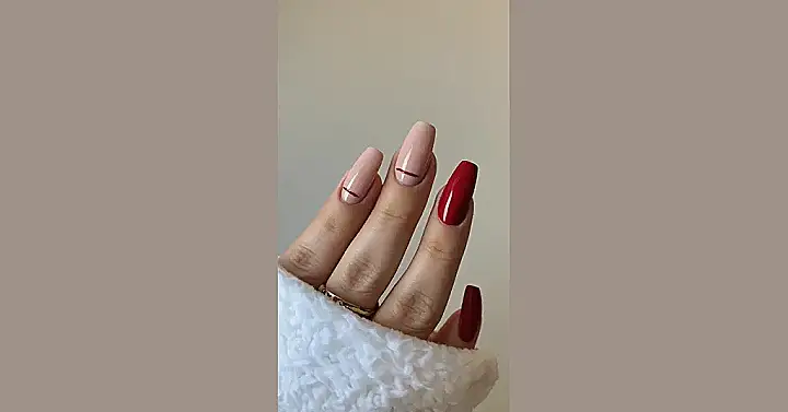 These nails are giving major “fall vibes” with their red accents! The subtle red lines on the nude nails are like a little whisper of autumn, while that bright red nail is like shouting “Hello Fall!” from the mountaintops. It’s like having your cake and eating it too, you know? A touch of elegance with a bit of playful boldness ‚Äì it’s the perfect mix for anyone who wants to show off their autumn style!