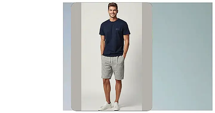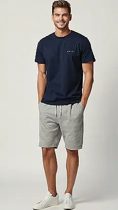 This guy is rocking a classic look that’s perfect for relaxing and hanging out with friends. A simple navy t-shirt and comfy grey shorts – talk about a winning combo! He’s got the “I’m not trying too hard, but I still look good” vibe going on. Maybe he’s heading to the park for a game of frisbee or just chilling on the couch with a good movie. Whatever he’s up to, this outfit makes him look super relaxed and ready to have a good time.